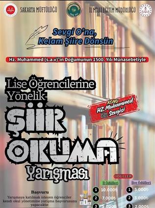 Sakarya Müftülüğü ve İl Milli Eğitim Müdürlüğümüz iş birliği ile Peygamber Efendimiz Hz. Muhammed’in (s.a.v) doğumunun 1500. yılı münasebetiyle düzenlenen “Sevgi O’na, Kelam Şiire Dönsün” temalı Şiir Okuma Yarışması başvuruları başladı.